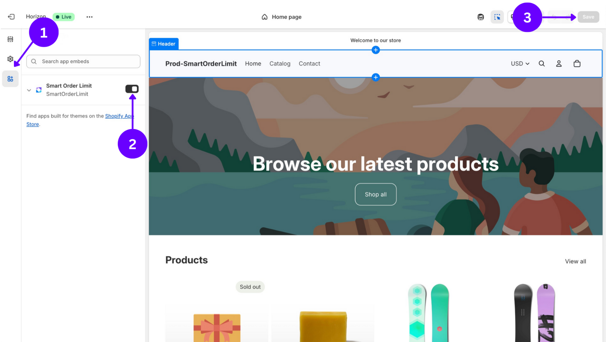 Find SmartOrderLimit in the list of app embeds